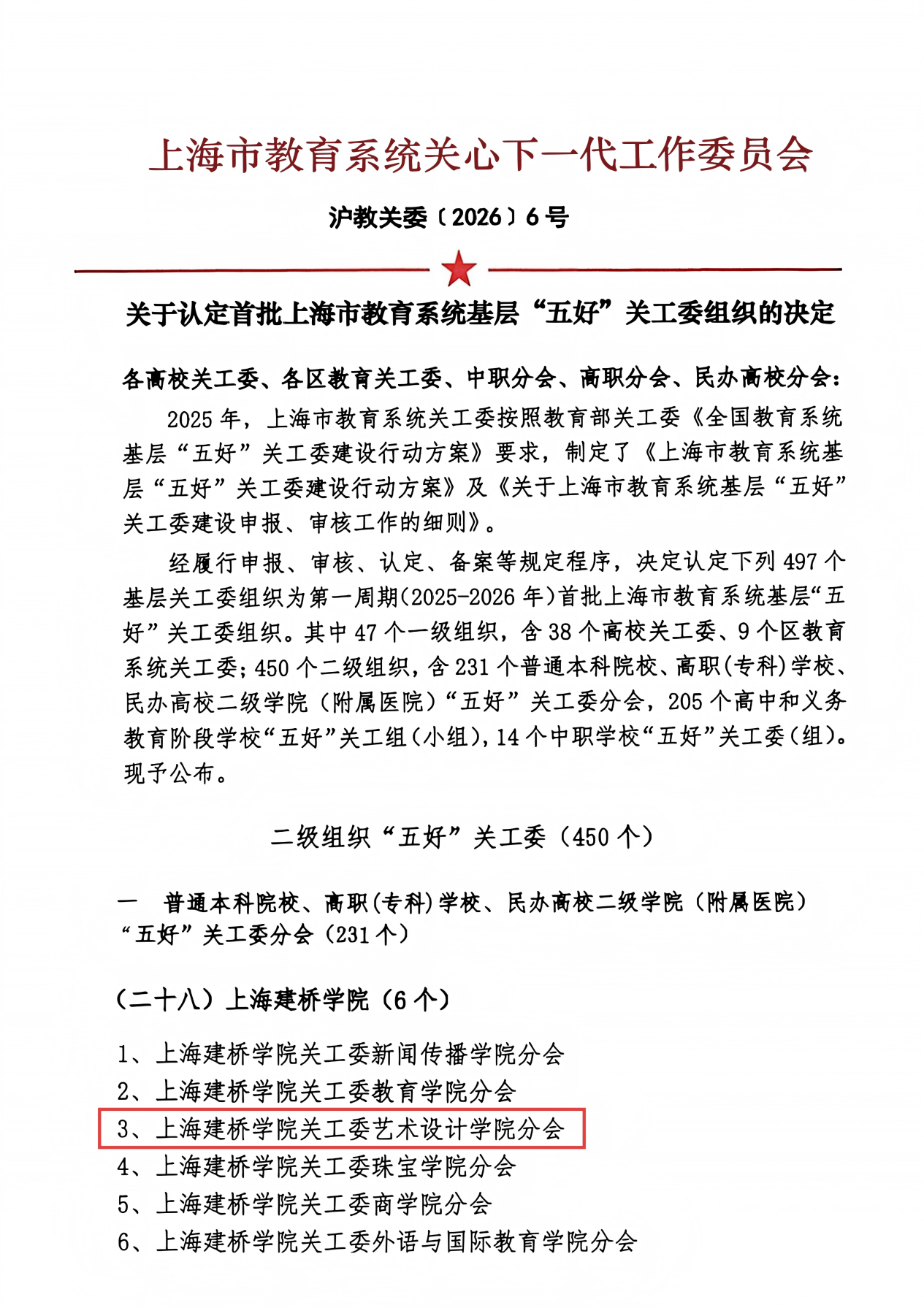 近日,上海市教育系统关心下一代工作委员会公布第一周期(2025-2026年)首批上海市教育系统基层“五好”关...