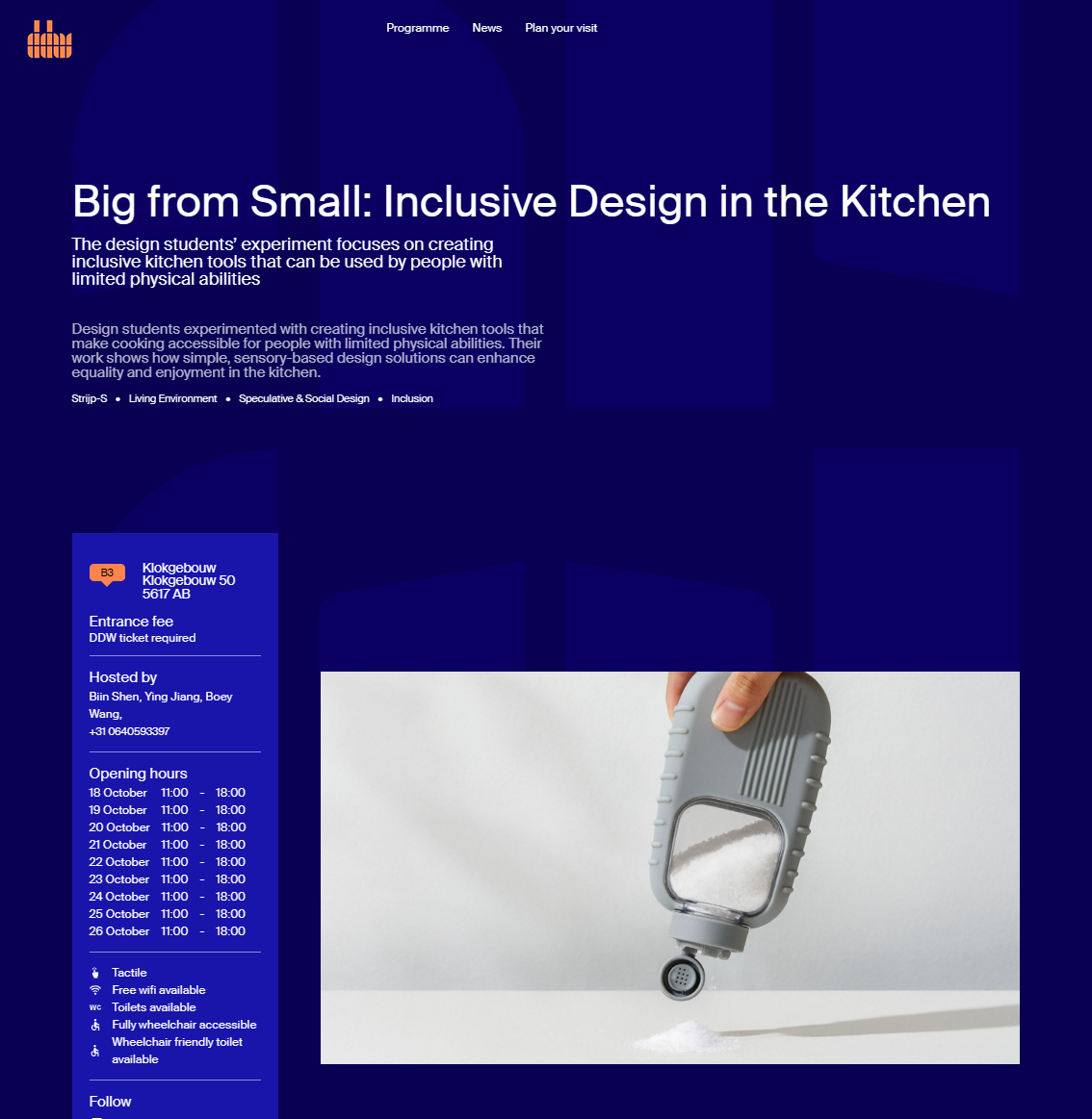 今年,第25届DDW以“过去、现在、可能”为主题,回顾其历史,展现当代创意活力,并探索设计的无限可能。此次上海建桥学院艺术设计学院携5件2024级试点班学生优秀作品在荷兰埃因霍温主展区“Kitchen for Everyone”展区面向全球观众持续展出,标志着上海建桥学院艺术设计学院在“包容性设计”方向上的教学成果与与国际化设计教育融合方面取得阶段性突破,充分展现了艺术设计学院试点班在培养拔尖创新设计人才方面的显著成效。