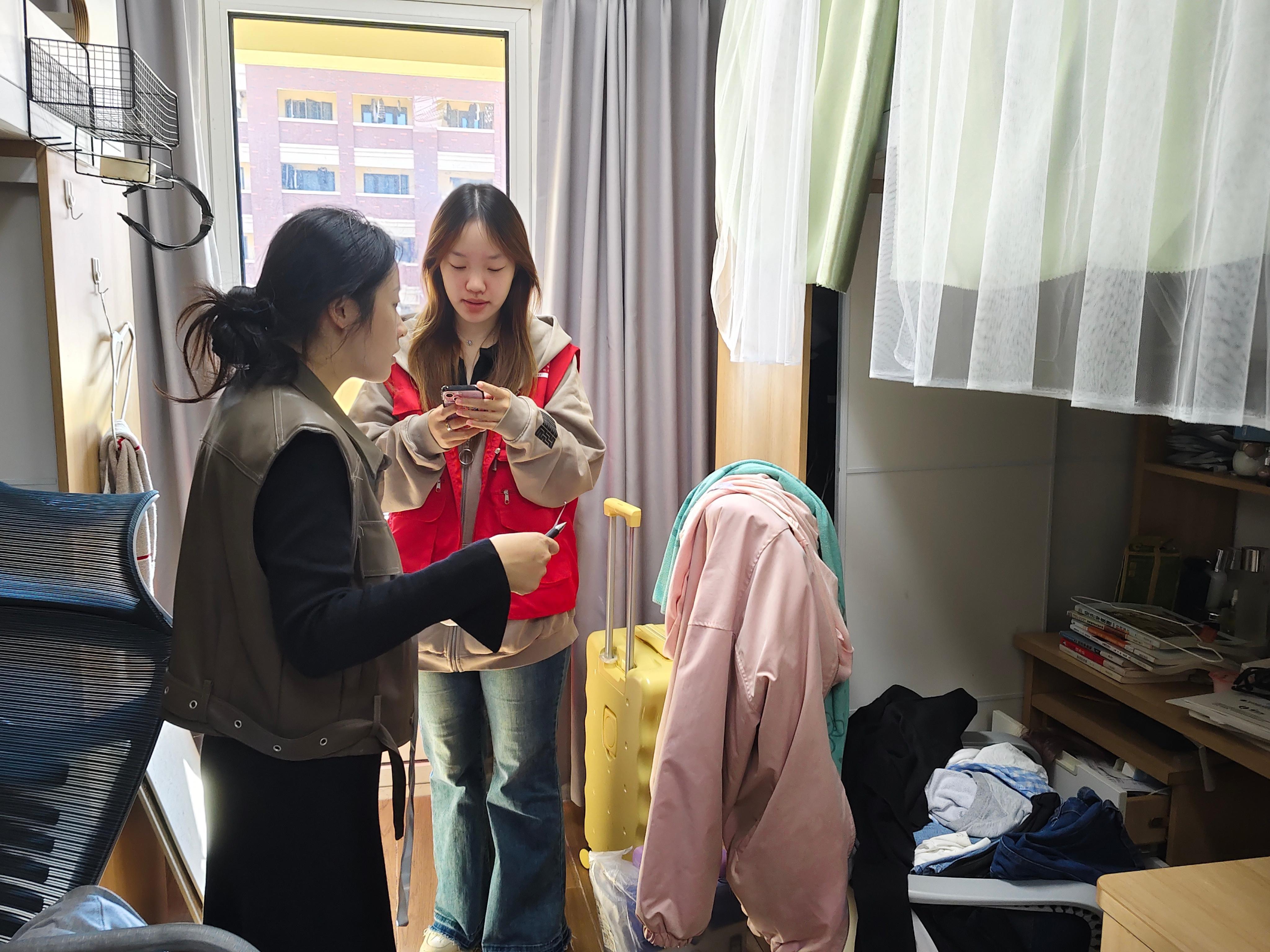 随后,11个查寝小组在辅导员老师的带领下,分赴各宿舍楼展开检查。各小组逐层逐间走访,认真对照“卫生检查情况反馈表”进行评估记录。辅导员们以身作则,不仅仔细查看阳台、桌面、床铺等区域的整洁情况,还重点排查了用电安全、物品堆放等潜在隐患。入党积极分子们积极配合,主动承担起沟通解释工作,耐心向同学们说明卫生标准和安全要求,对于部分宿舍存在的物品摆放杂乱、垃圾未及时清理等问题,现场提出改进建议并协助整理。在检查过程中,师生们还就如何保持宿舍环境、营造良好生活氛围等话题与同学们展开交流,将规范要求转化为生动的生活教育,增强了学生的自我管理意识和集体责任感。