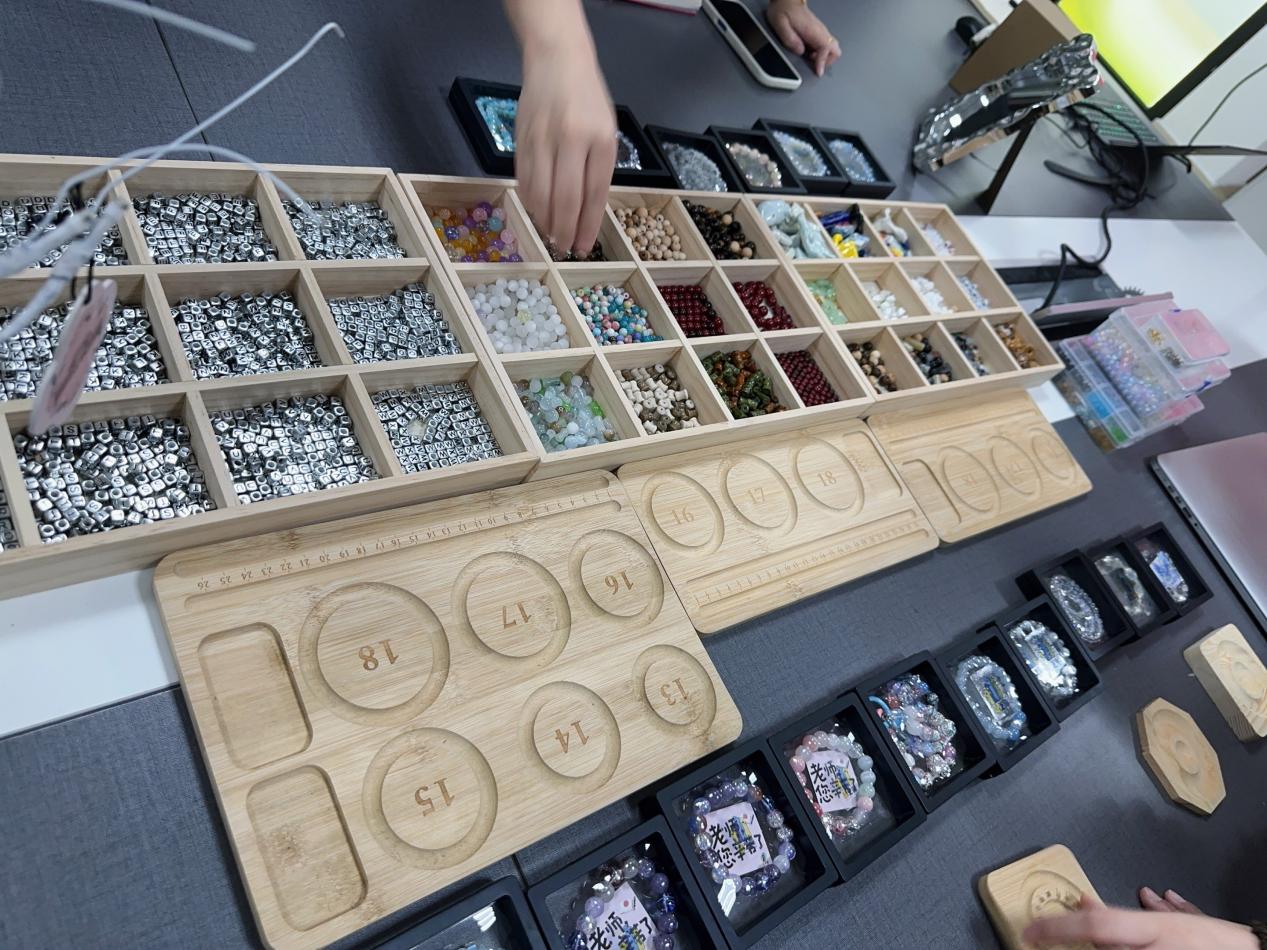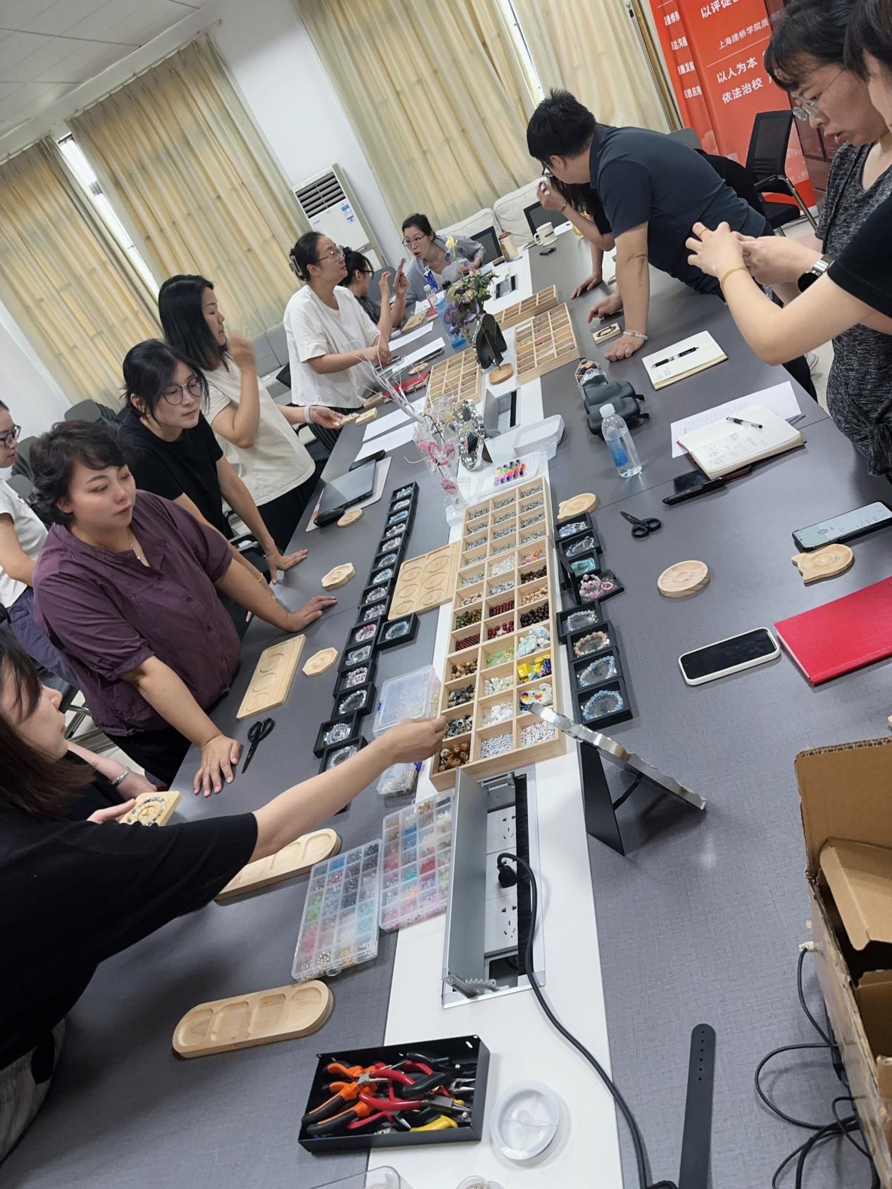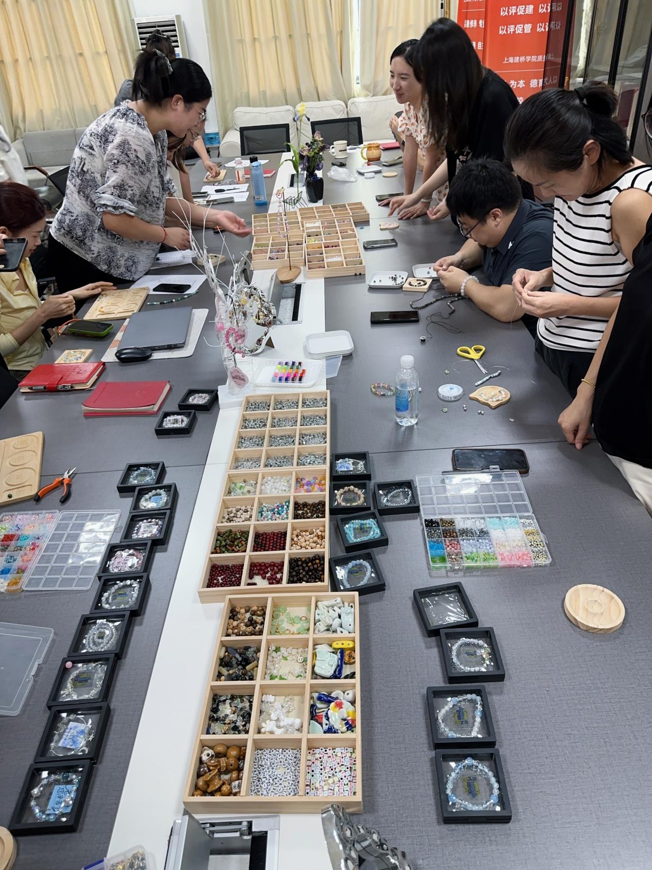 在动手制作环节,教师们充分发挥自己的创意与巧思。工作人员精心准备的手串材料包中,桃木、玛瑙、菩提、青金石等不同材质的珠子色彩斑斓,搭配上隔珠、顶珠等挂坠,充满节日氛围。教师们自主挑选心仪的材料,按照示范步骤认真制作手串,过程中不时相互交流制作心得,整个制作过程温馨又欢乐。