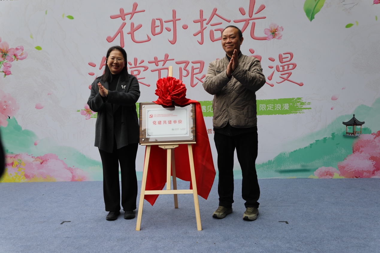 本次参展是上海建桥学院艺术设计学院党委与上海人民公园经营管理有限公司党支部开展党建共建的成果之一。开幕式上,学院党委书记王丽佳与公司党支部书记金溢彬共同为“党建共建单位”揭牌,标志着双方合作迈入制度化、常态化的新阶段。双方以“资源共享、优势互补、协同育人”为原则,将人民公园红色景点作为学生党员教育、专业实践与志愿服务的重要阵地,未来将在党建活动联办、文创产品开发、导览视觉优化等方面开展深度合作。学院党委书记王丽佳表示:“把支部建在项目上,让党旗飘在展位上,通过真实场景中的设计实践,引导学生扎根上海、服务社会,用专业能力回应人民需求,这正是党建引领育人的生动体现。”