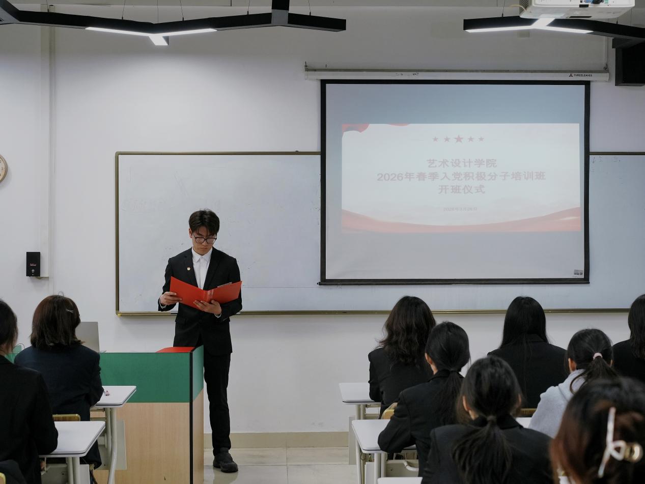 为强化入党积极分子思想政治引领,严把党员发展“入口关”,夯实党员发展工作质量,3月26日下午,艺术设计学院党委在艺术楼327教室举行2026年春季入党积极分子培训班开班仪式。本次培训班35名学员全员参会,仪式由培训班班长黄佳丰主持,学院党委宣传委员刘慧慧老师出席并作讲话。