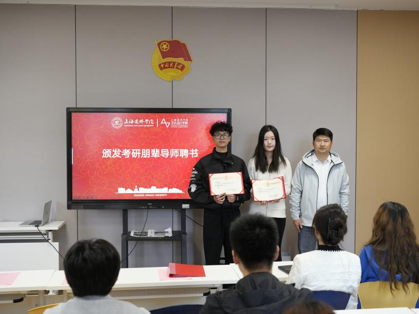 为深化朋辈帮扶实效,陆书记代表学院为冯佳越、张家鹏2位优秀学子颁发考研朋辈导师聘书,鼓励两位优秀学子持续发挥模范作用,为学弟学妹答疑引路。